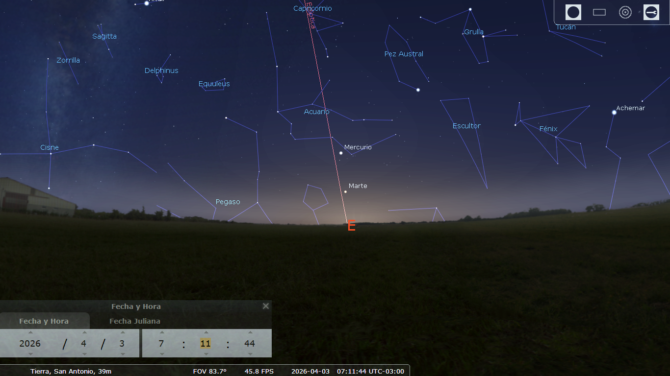 (2 Abril, 2026) El planeta Mercurio se asoma sobre el horizonte del Este poco antes del amanecer, 06:10 horas. El viernes 3 se encontrará en su máxima elongación occidental, su punto más alejado al oeste del Sol, con lo que quedará a la vista por unos minutos antes que el Sol aparezca. Este esquivo planeta es difícil de observar pero en estos días quienes se encuentren en el hemisferio sur serán los más favorecidos.