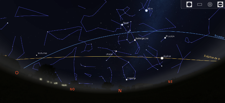 (1 Diciembre, 2025) El planeta Saturno está visible desde el comienzo de la noche frente a Piscis y Júpiter aparece a las 00:00 frente a Géminis.