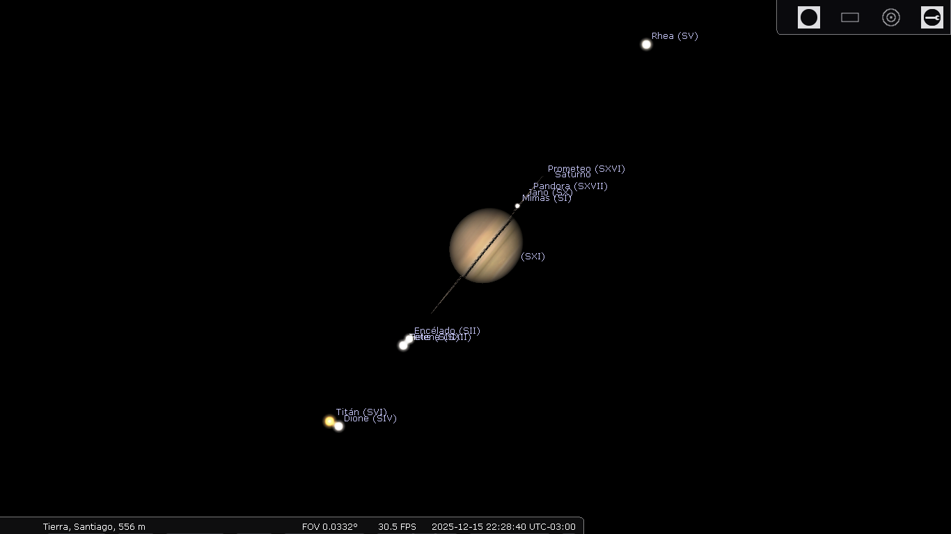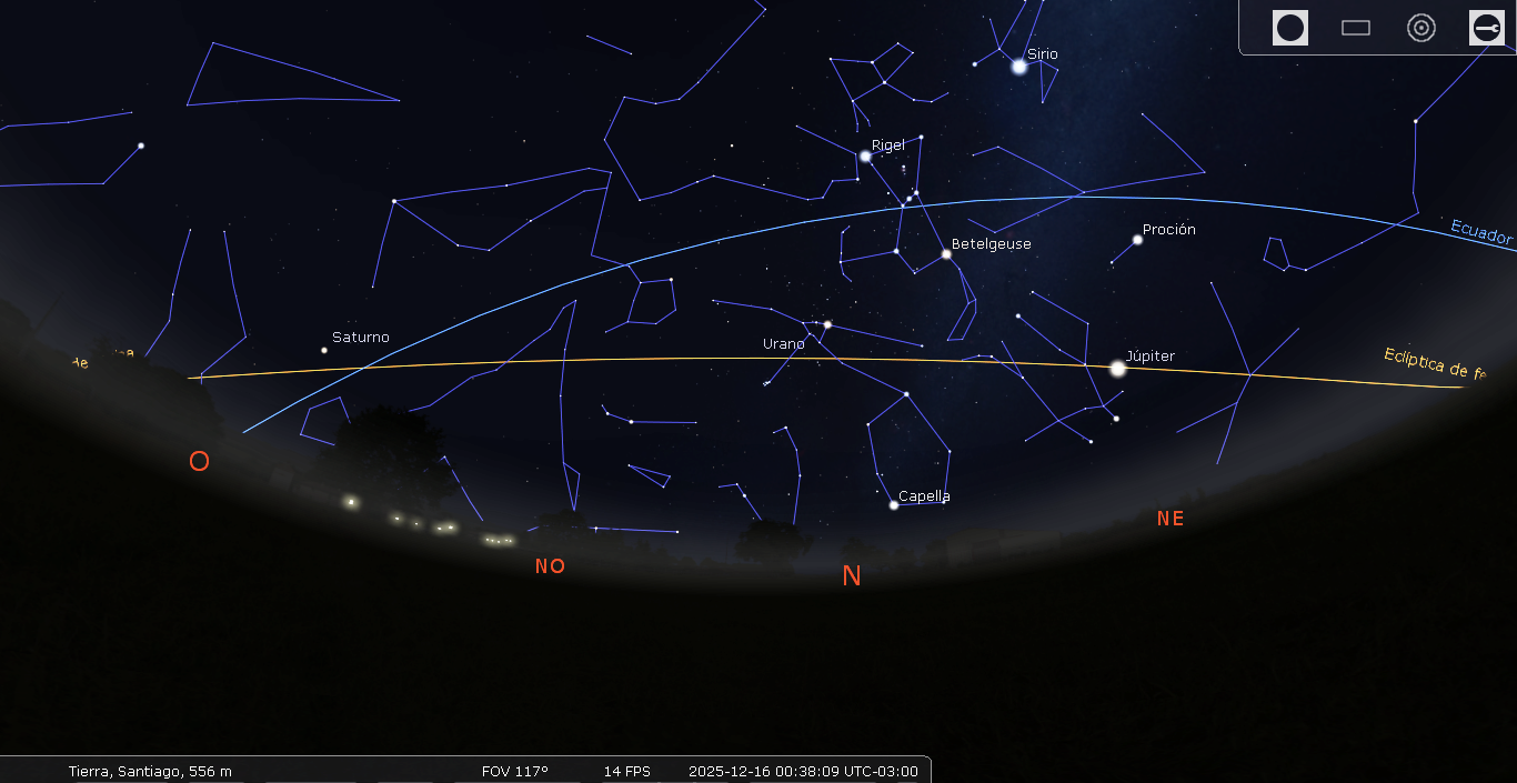 (15 Dic. 2025) El planeta Saturno está visible desde el comienzo de la noche frente a la constelación de Piscis. Pero no intente identificarlo por sus anillos, pues por esta vez apenas se ven, aunque esté utilizando un telescopio.