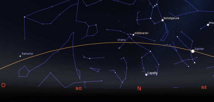 (1 Enero, 2026) Los planetas Saturno y Júpiter están visibles desde el comienzo de la noche, el primero frente a Piscis por el Oeste y Júpiter por el Este frente a Géminis.