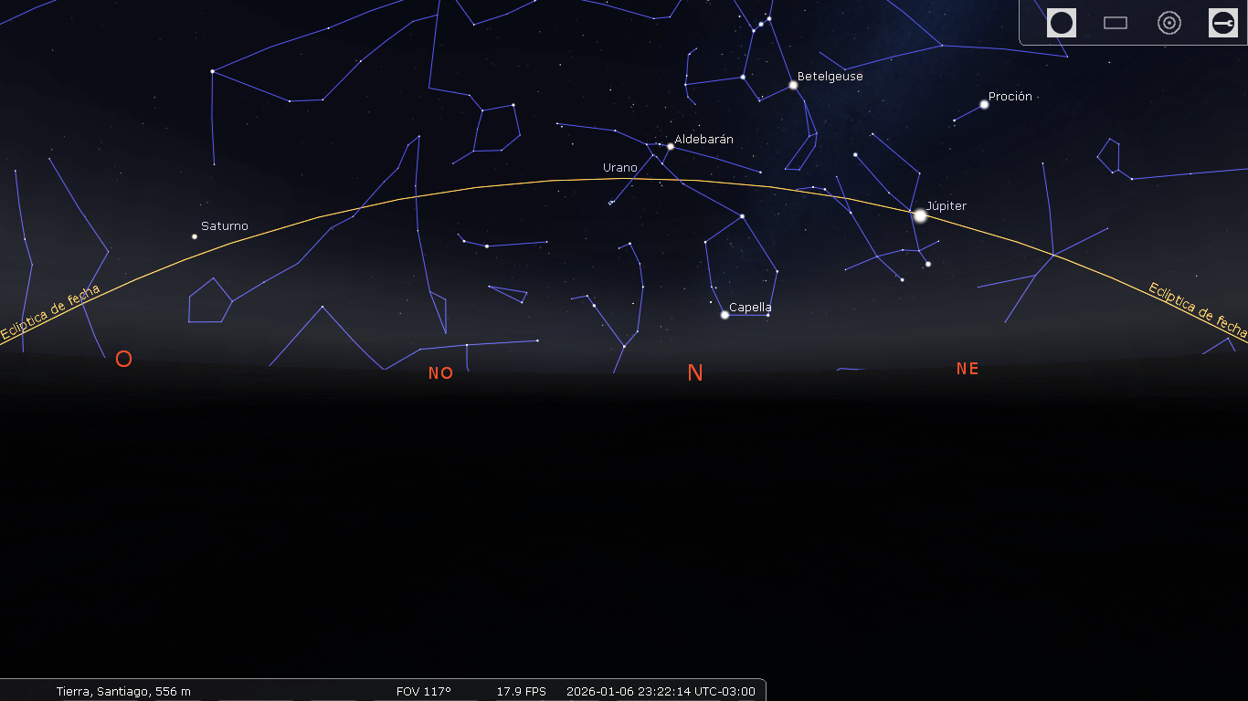 El planeta Júpiter será el protagonista del cielo nocturno del comienzo del 2026. El planeta gigante con sus movedizoa satélites alcanzará su Oposición el 8 de enero, por lo que es el mejor momento para observarlo ya que además de alcanzar su máximo brillo, está toda la noche en el cielo, desde el atardecer hasta el amanecer. Pasa frente a Géminis.