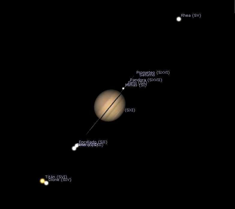 Imagen arriba: Los satélites de Saturno se amontonan a su alrededor y sus anillos apenas se ven. Agrandar.