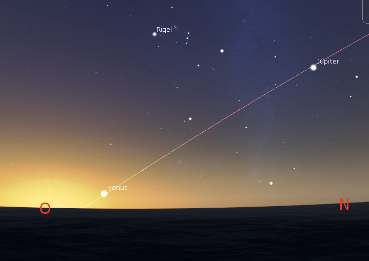 Más arriba en el cielo del Oeste entre las estrellas de la constelación de Géminis encontraremos al planeta Júpiter, que la deriva del cielo lo arrastra hacia el horizonte del Oeste, debido al movimiento de la Tierra alrededor del Sol de Oeste a Este. Se encontrará con Venus el 9 de junio, en una magnífica conjunción.