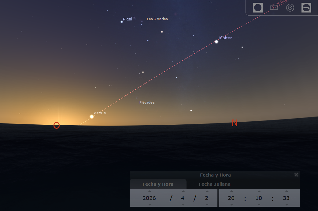 (2 Abril, 2026) El planeta Venus ya es visible al anochecer, por sobre el horizonte del Oeste. Inicia una magnífica y larga aparición que lo llevará a recorrer seis constelacones zodiacales entre abril y septiembre.