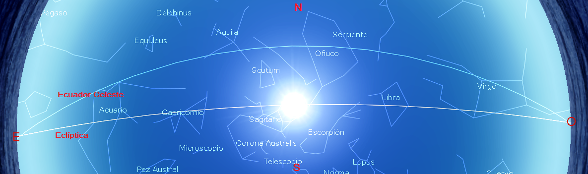 Imagen: El Sol para el Solsticio de diciembre visto desde la Tierra, pasa frente a las constelaciones de Sagitario y Ofiuco, el 21 de diciembre cruza en el cielo la línea de Ascención Recta 18 horas. Haga click en la imagen para agrandar. Ilustración: Stellarium.