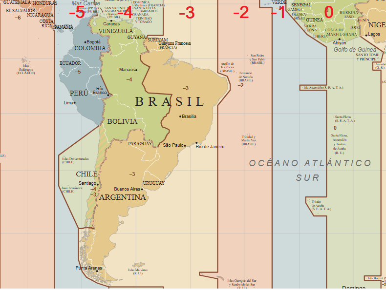 Imagen arriba: En este mapa de las Zonas Horarias de Sudamérica, se puede apreciar como al adoptar la ZH -3, las horas de Argentina y Chile han quedado desfazadas de su horario natural, Argentina en una hora y Chile en dos.
