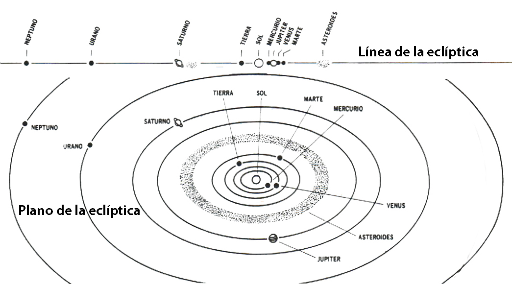 Imagen arriba: Posiciones de los planetas en el plano de la eclíptica con respecto a la Tierra. Tamaños y distancias no están a escala. Vistos desde el hemisferio sur del Sistema Solar el movimiento de los planetas alrededor del Sol es a favor de los punteros del reloj.