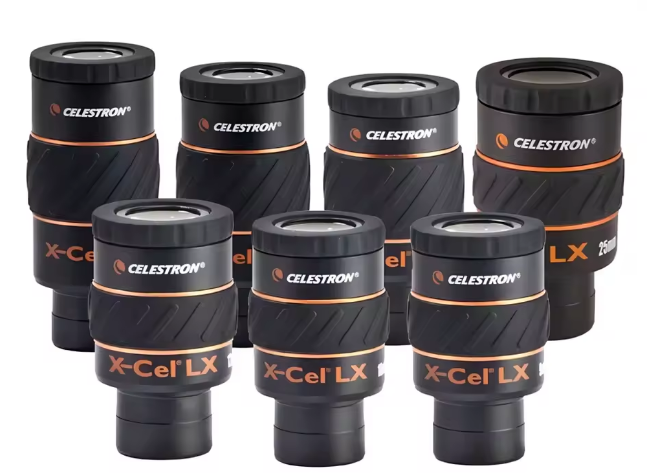 Imagen: Oculares Celestron de la Serie X Cel LX de 1,25 pulgadas. Haga click en la foto para agrandar a tamaño natural.